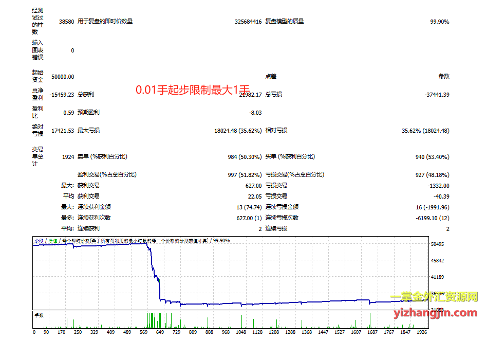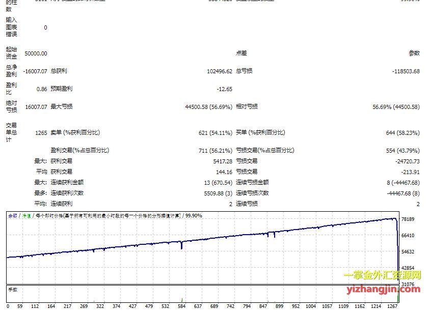 在默认参数下,该策略采用止损后反方向加倍下单的方式,且不限制加倍倍数和最大持仓手数。若投资者本金充足且不触及平台最大手数限制,资金曲线会很好看。然而,一旦对本金和最大手数进行限制,从长期来看,该策略基本难以取得良好效果。毕竟,其利润是靠高风险赌博得来的,只要稍微控制风险,策略的弊端就会立刻显现。所以,在研究策略时,一定要先充分了解其风险,再进行评价。