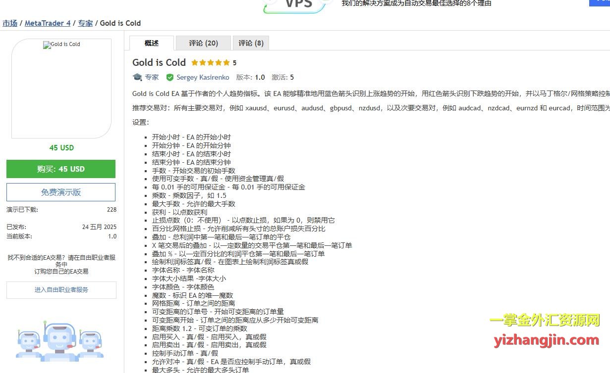 Gold is Cold是mql5平台的一款热门策略,属于马丁类,价格为45美元。该策略作者在描述中明确指出其使用了马丁机制,这种坦率的态度在当前策略市场中实属难得。许多高风险策略往往对马丁机制含糊其辞,唯恐用户因了解其机制而放弃购买,而该作者的做法更显专业与诚信。