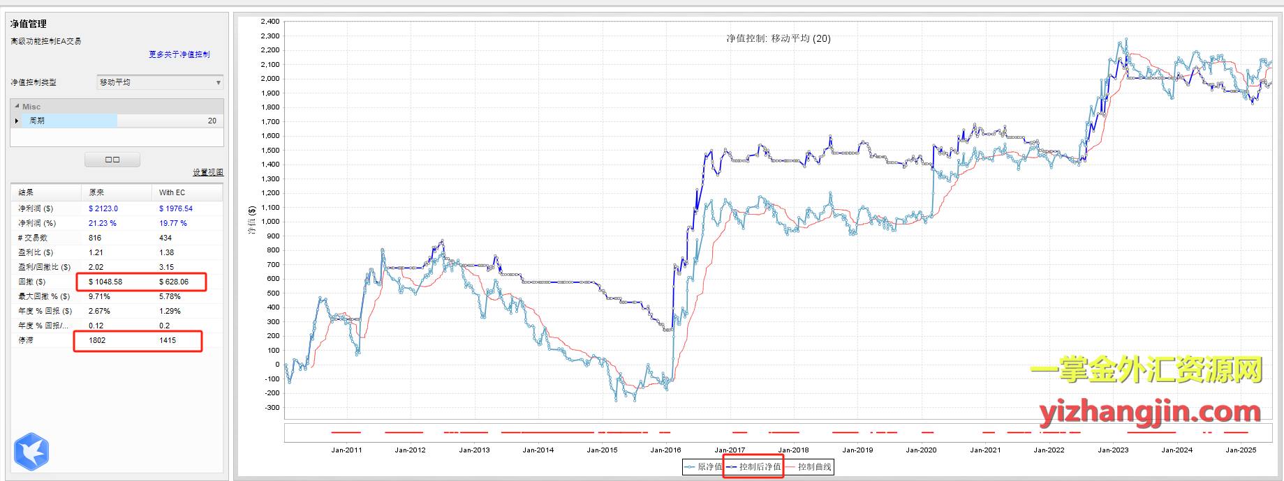 在 Quant Analyzer 提供的官方示例中,使用了20期移动平均线作为净值控制的基准。当净值曲线高于20期移动平均线时允许交易;当净值曲线低于20期移动平均线时禁止交易,仅模拟更新净值曲线。官方还介绍了扩展的一些内容,比如在回撤超过某一阈值后,增加交易手数以期快速恢复资金;根据连续亏损次数动态调整仓位大小。有感兴趣的可以去官方去看下。