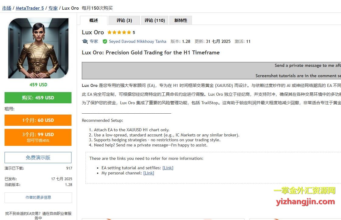 Lux Oro是近期MQL5上热门EA,按照客户要求做下测评,其作者描述里展示了“圣杯曲线”般的完美回测结果。但该EA限制了2016年之前的历史数据回测。 凭这一限制或者圣杯式曲线,就足以让理性的研究者将其排除,限制历史某些年份回测存在与很多mt5的ea中,旨在规避早期不利数据的检验,只保留好看的测试结果,另外就是作者不具备完整的高质量数据,只能以mt5默认的近几年数据做训练或者做套路。