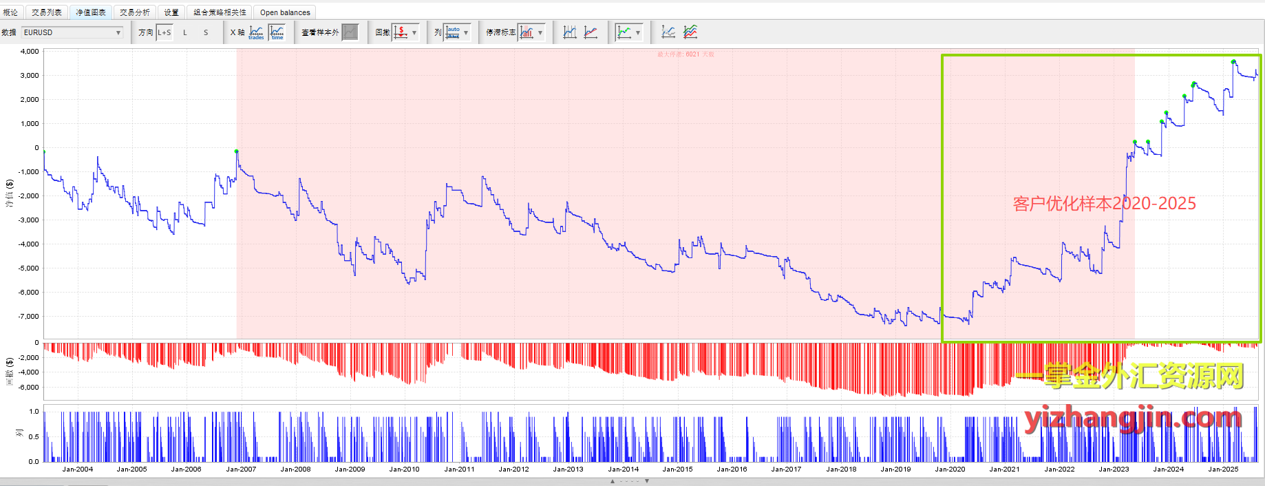 从测试结果来看,客户优化后的参数在资金曲线上呈现出明显的阶段性差异,尤其在2020年之后表现相对亮眼。初步推测客户是以2020-2025年作为优化样本区间进行调参,从而在样本内取得了较好表现。然而在样本外(2020年之前)的表现则震荡下跌。