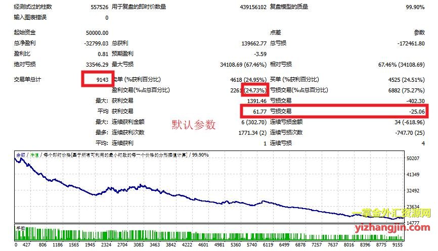 CCI趋势交易EA是客户提供的一款做EURUSD的高盈亏比策略。客户提供了自己优化的参数。我对客户优化参数与默认参数分别进行了2003-2025年间的回测测试,测试结果如图所示。