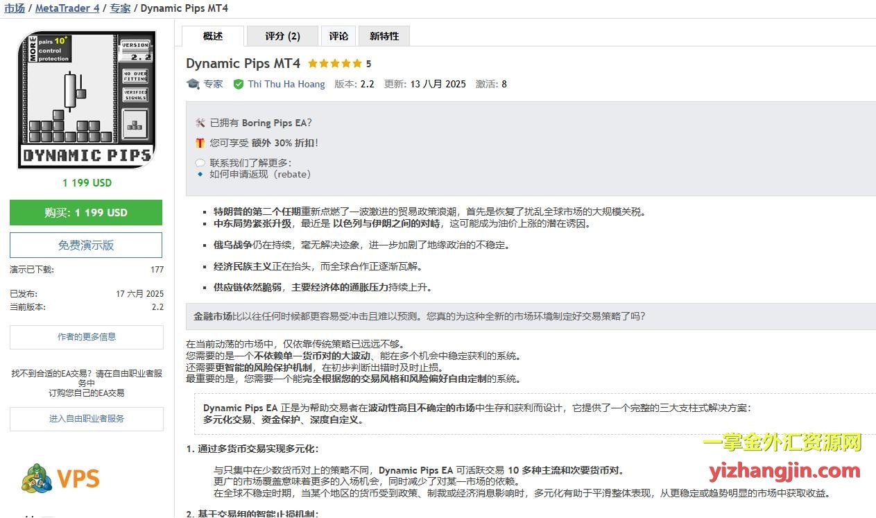 Dynamic Pips MT4 v2.2 是客户送来测评的一款采用马丁加仓机制的EA。该EA于今年6月正式发布,标价高达1199美元,定位为高价EA。其核心逻辑关键词是:动能、供需区域、斐波那契回撤、人工智能。风控方面,该策略采用“每单统一设置大止损”的机制,最大单笔止损幅度设定在5000微点以上,确保不会因短期波动频繁触发止损;同时设定了最多20单的持仓上限,以控制极端行情下的风险失控。