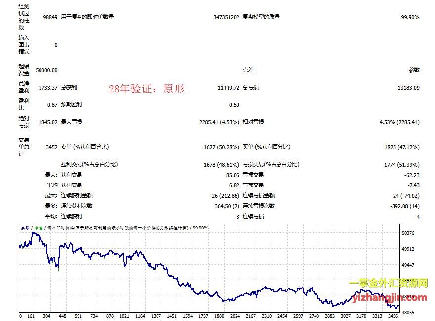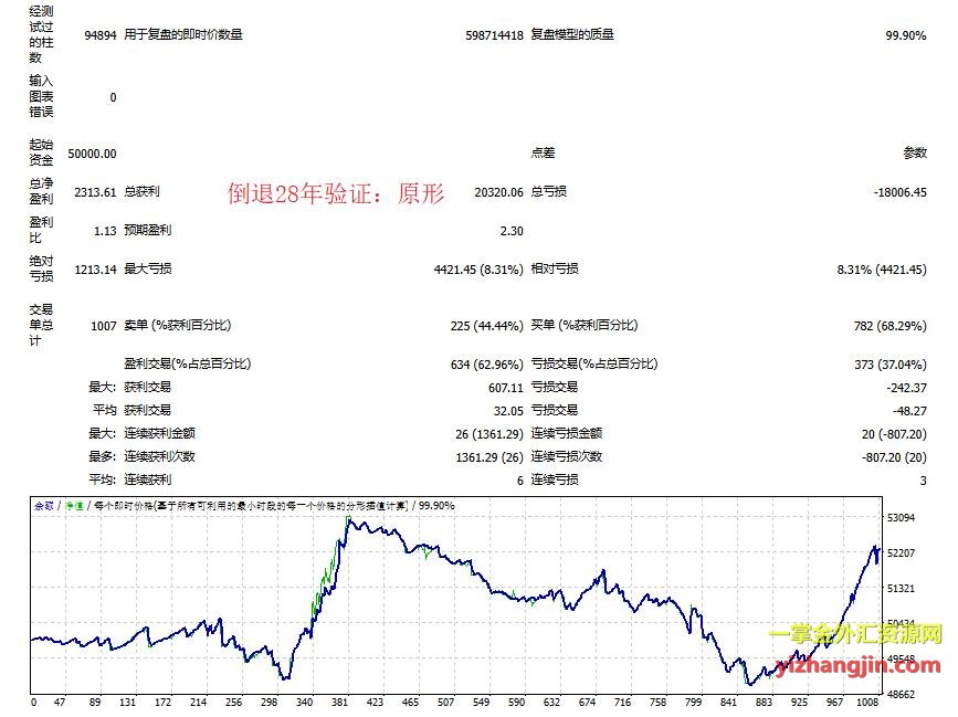 为进一步检验其真实性,我采用了倒退28年的回测验证方法。这类测试通常会呈现三种结果:一是回测表现与默认参数基本一致,需进一步排查;二是结果与默认回测结果严重不符,直接暴露其回测造假;三是测试本身被限制而无法执行,说明作者有意规避验证。针对Silicon Ex的测试显示,它属于第二种情况——在长期回溯中表现与原结果完全偏离,从而可以明确判定为人为操纵回测的造假EA。