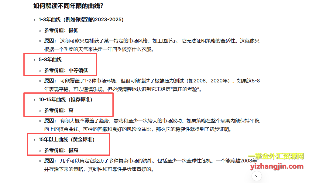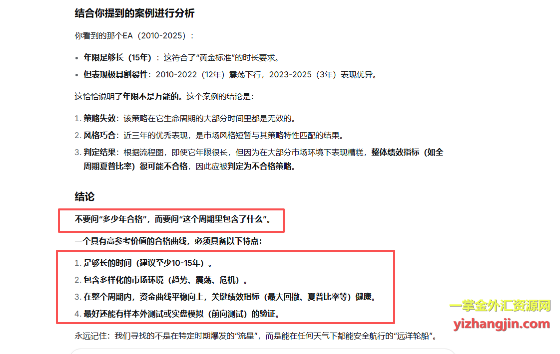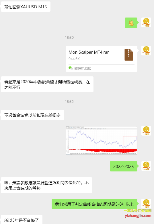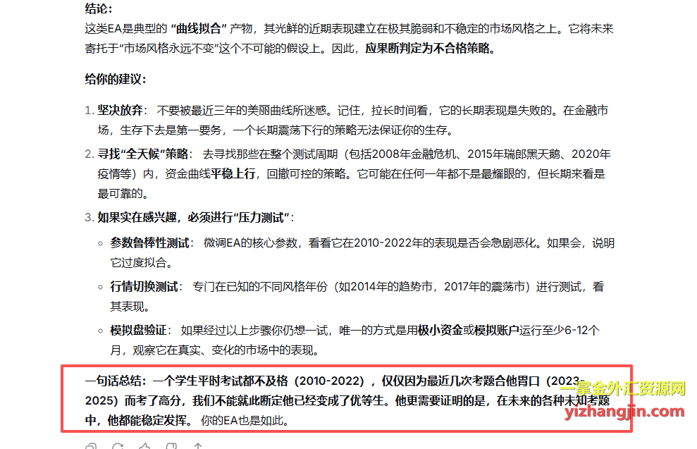 另一款“Mon Scalper”来自台湾客户,测试后发现了类似的特征:2023年前资金曲线呈现震荡下行态势,而最近三年却表现突出。不论这是行情恰好匹配还是其他原因,评估的关键在于我们选择的参考时间周期。在回复客户时,我截图了AI的一个精妙比喻:一个学生平时考试都不及格(2010-2022),仅仅因为最近几次考题合他胃口(2023-2025)而考了高分,我们不能就此断定他已经变成了优等生。他更需要证明的是,在未来的各种未知考题中,他都能稳定发挥。 你的EA也是如此。