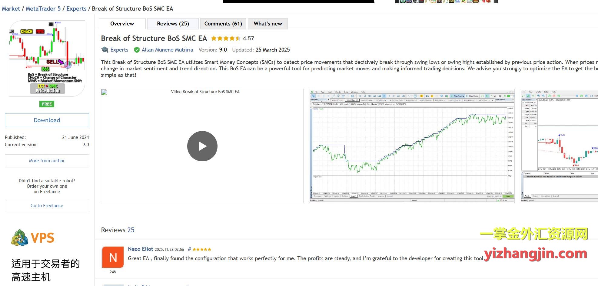 Gold Ict EA 是一款MQL5的免费MT5策略,其特点是强制止损幅度较大,且每次交易会同时下两单。由于导入的数据可能受限,无法进行回测,因此仅使用平台自带数据进行了测试。从结果来看,资金曲线虽然波动较大,但整体呈坎坷上行趋势,在免费策略中表现尚可,不过仍有改进空间。有兴趣的话可以进一步调整和优化试试。 另一款Break of Structure BoS SMC EA同样免费,主要推荐的品种资金曲线震荡或下行,总体感觉策略质量一般,就不做深入研究了。 总的来说,市面上收费的 EA 虽然不乏造假和套路,但免费的策略往往开发较为粗糙,给人一种“半成品”的感觉。因此,可以适当研究,但不必耗费过多精力在其中。