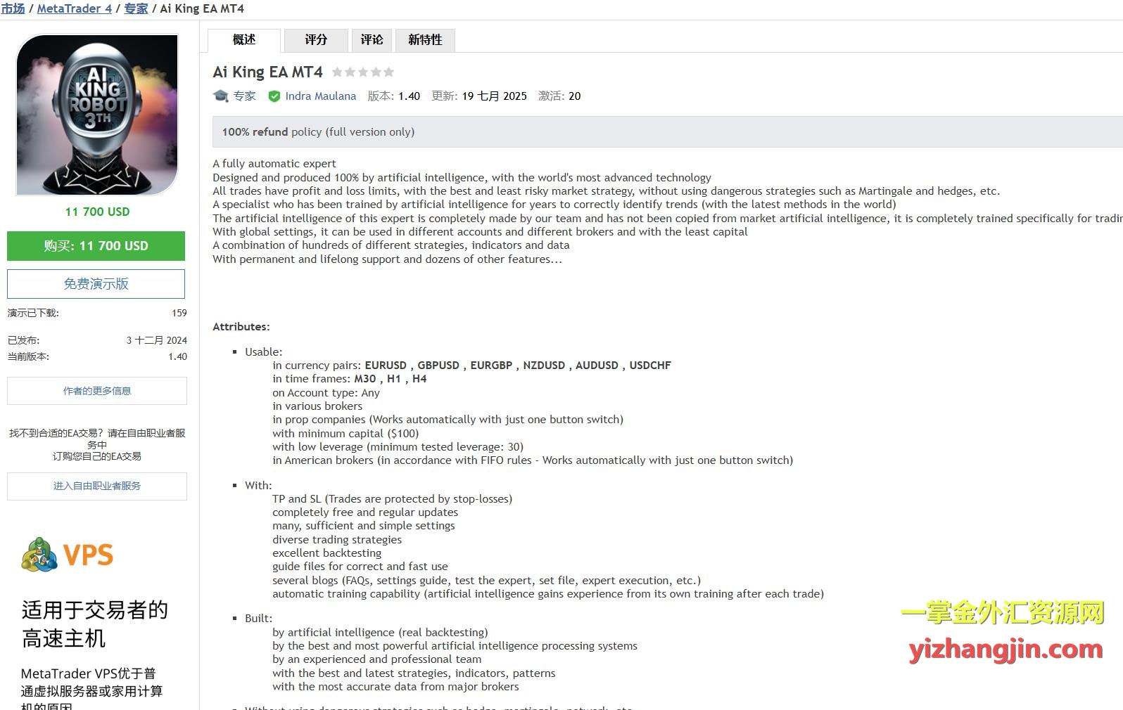 AI King EA 是一款客户委托测评的挂单突破型ea,在MQL5平台上的标价为11700美元。该策略属于头皮类型,但并非针对凌晨时段设计,因此测试时采用了相应的逻辑条件。其平均盈利空间约为40微点。