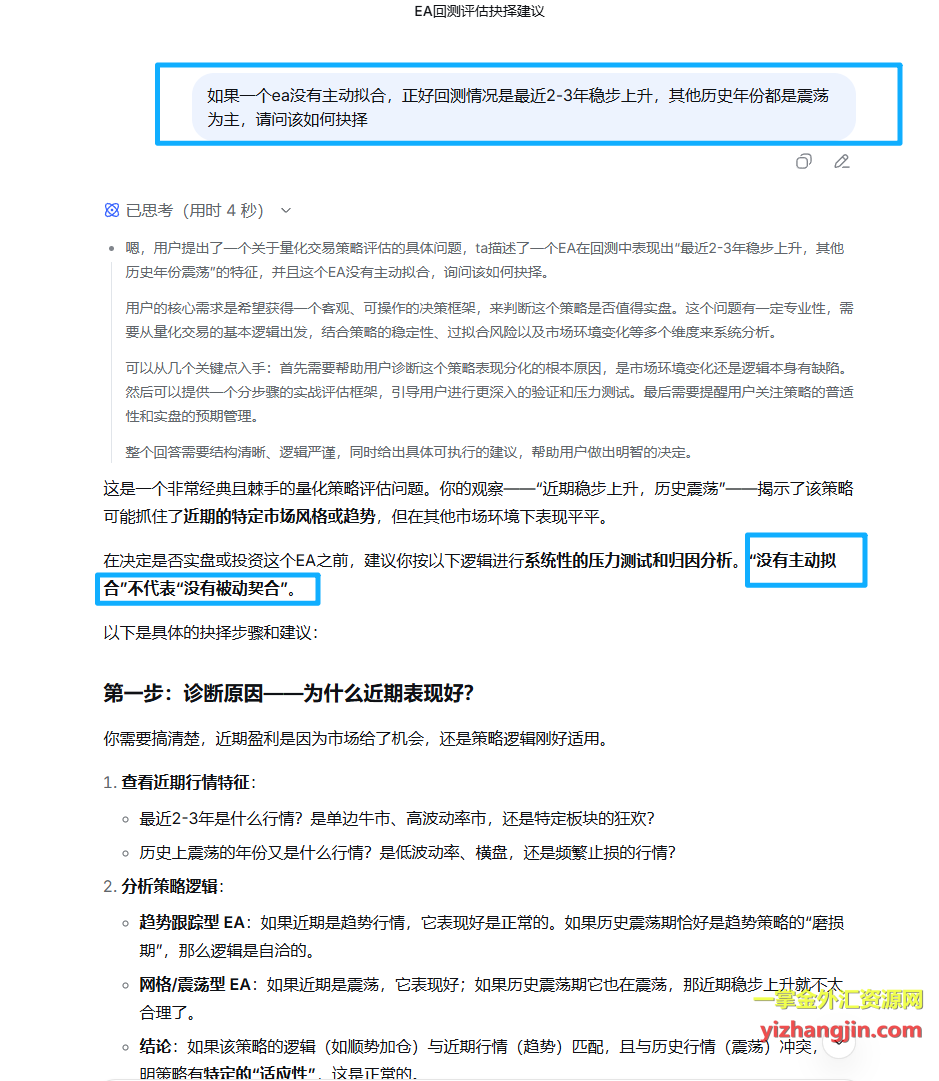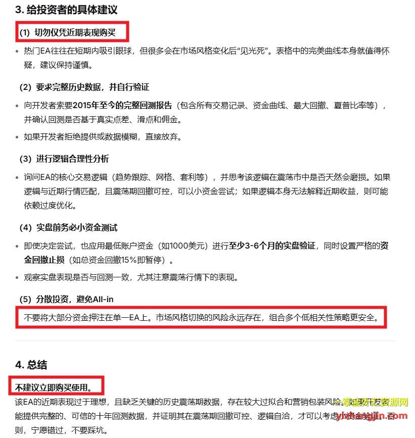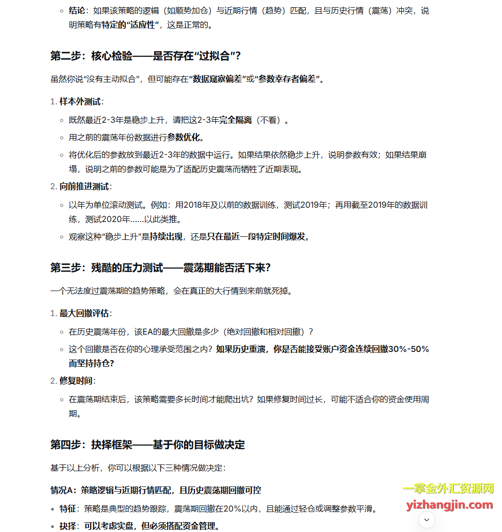 问题的关键不在于开发者是否“主动拟合”,而在于EA的生命周期决定了它无法绕过完整的牛熊验证老EA至少经历过几轮风格切换,能在历史震荡中存活下来本身就证明了其逻辑的适应性;而这些新EA之所以拿不出长时间的实盘观摩或者长时间回测报告都不愿意拿出,甚至像这个ea限制2020之前回测,本质是因为它们就是为这段特定行情“量身定制”的产物——无论开发者主观意愿如何,只要是在近期行情下调试出来的策略,必然带有对这段行情的路径依赖。被动拟合比主动拟合更隐蔽,但杀伤力是一样的:一旦市场风格切换,这些“圣杯”会集体失效。