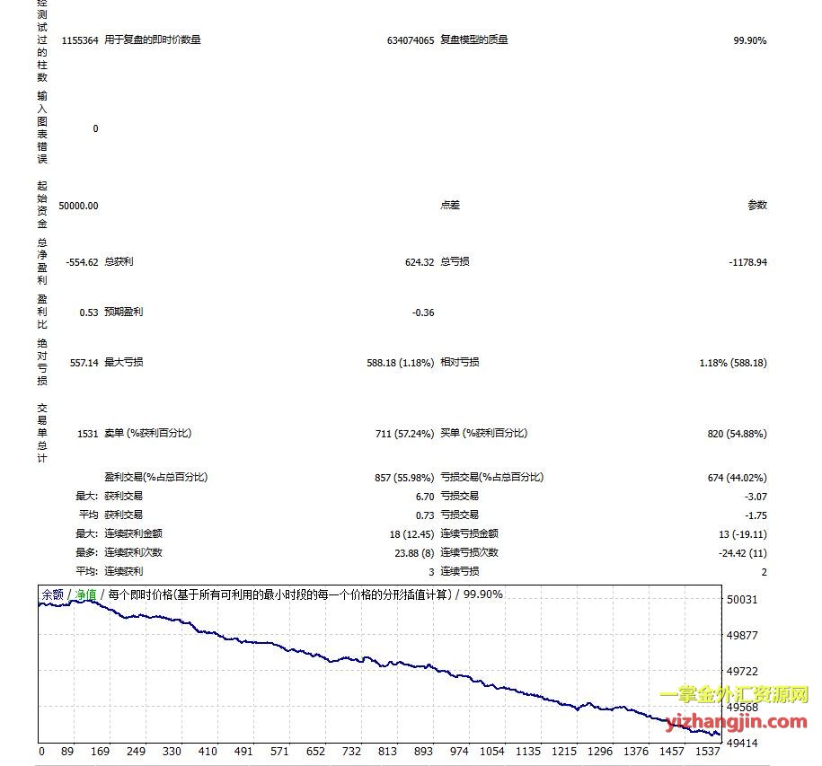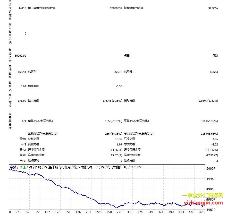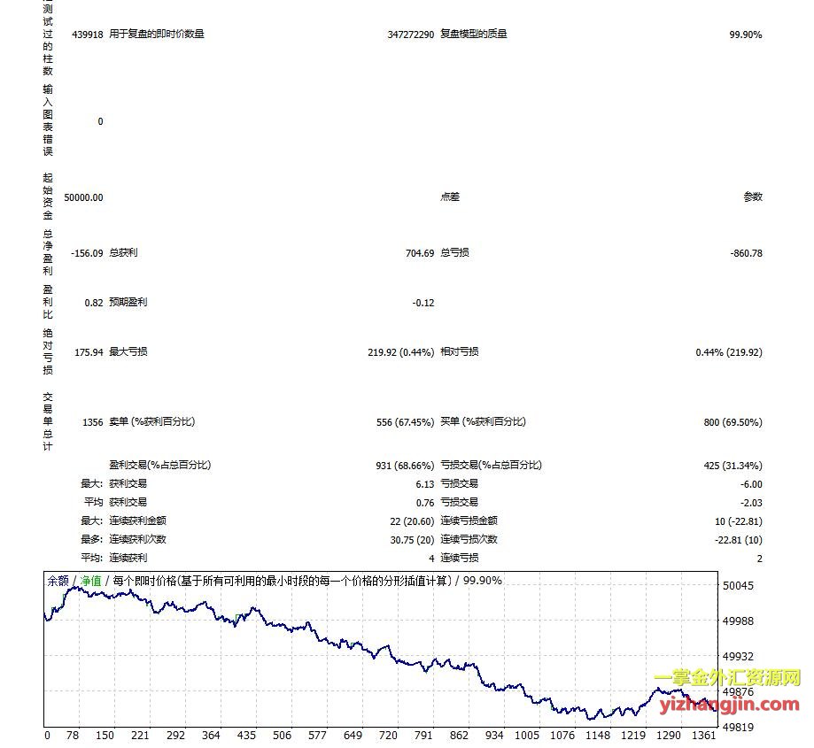 我选取了三个年份进行简单测试,该策略三个时间段都属于振荡下行。交易频率很高,属于典型的突破刷单型EA,但平均每笔盈利空间不足100微点。对于黄金这个品种来说,这样的盈利空间在实盘中很难持续获利,因此不建议采用,归类为不合格策略。