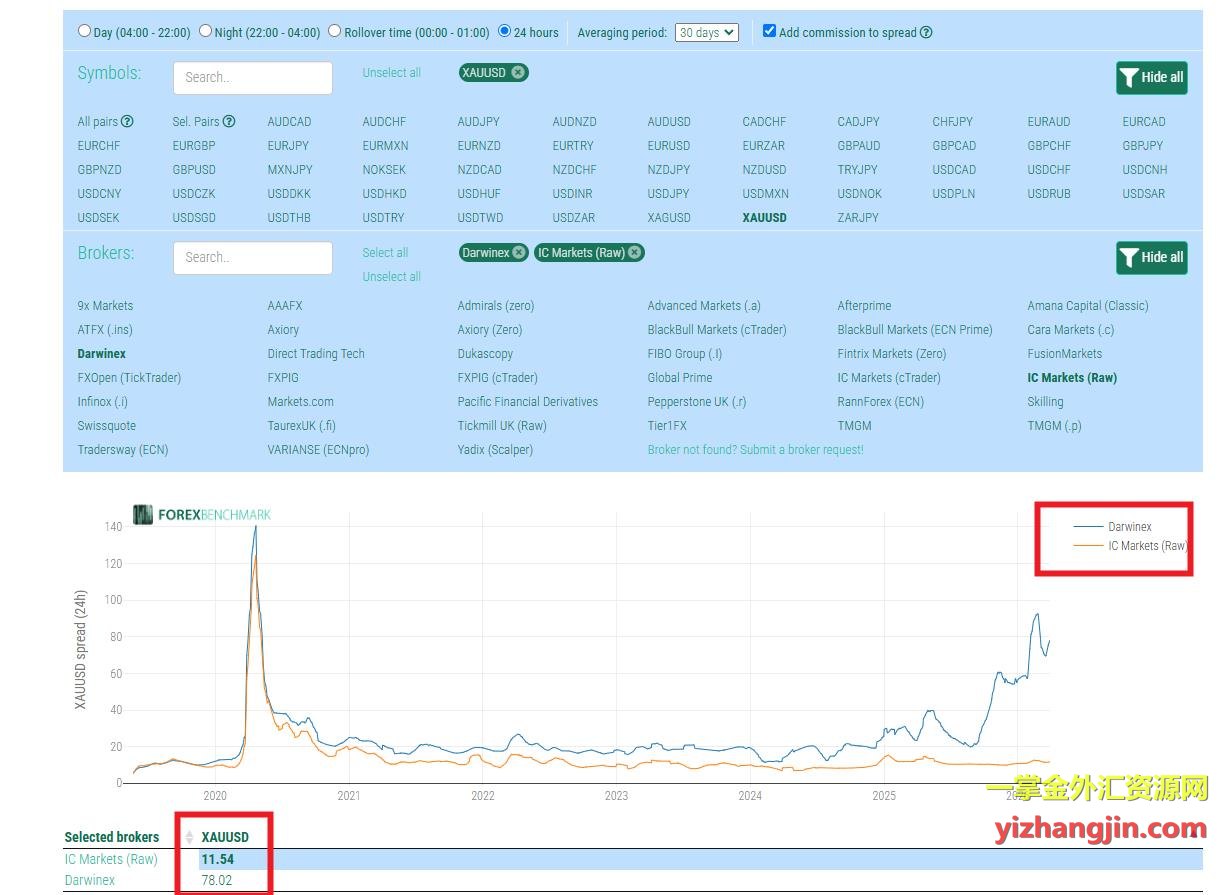 另外,昨天发的历史点差比对网址是https://forexbenchmark.com/brokers/historic_spreads/。这个网站是回测时的重要参考工具,有助于了解平台点差的变化规律及其多平台关联度。比如近一年来达尔文黄金的点差倍数增加(最后一图),相比一般ECN平台提高了七八倍,在该网站上可以很直观地看到点差的变化。因此如果自己实盘使用的是正常ECN平台,那么用达尔文的数据做近一年回测,参考意义就非常有限,以此类推。