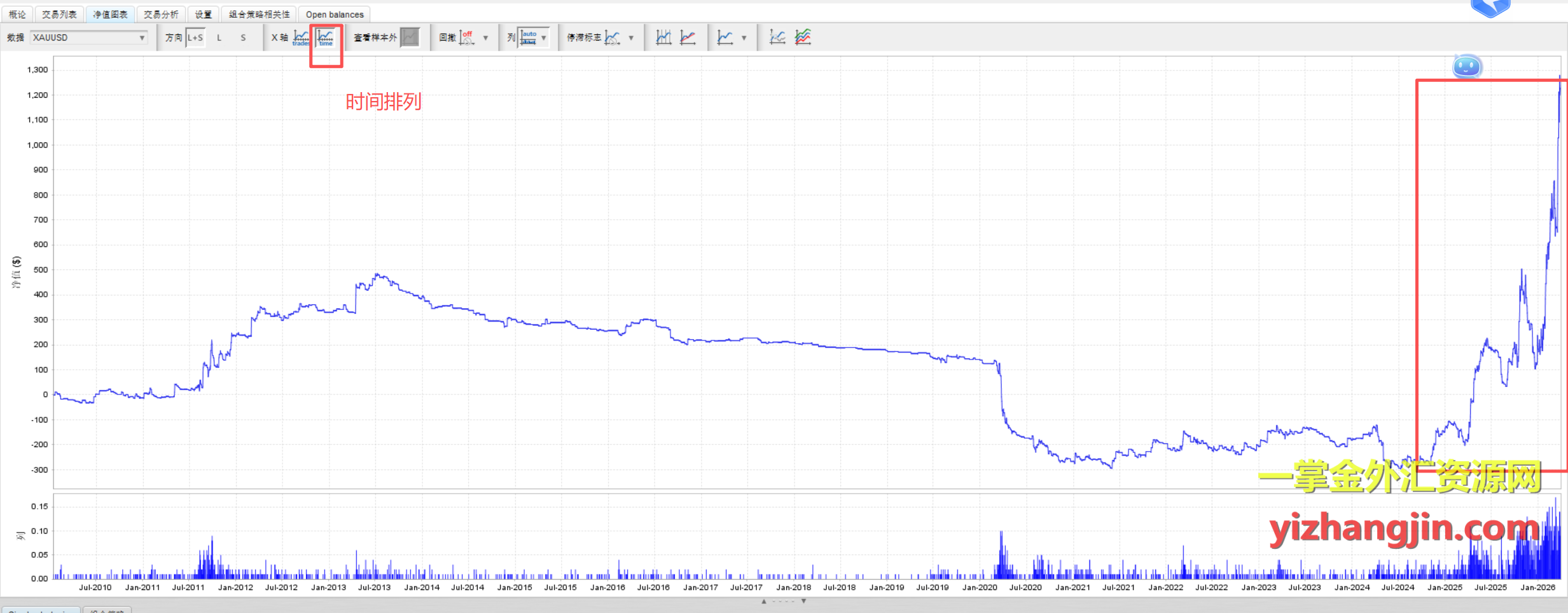按照要求,我对该EA在黄金品种上进行了2010-2026年的测试。从结果看,感觉是大部分时间相对稳定,但导入qa按时间顺序排列整体资金曲线,会发现盈利主要集中在这三年,其余历史年份基本呈现震荡下行,同时交易量也高度集中在近期,前后表现差异十分明显。虽然客户宣称没进行近期数据优化,但结合前后曲线异常和参考周期标准归为不合格。