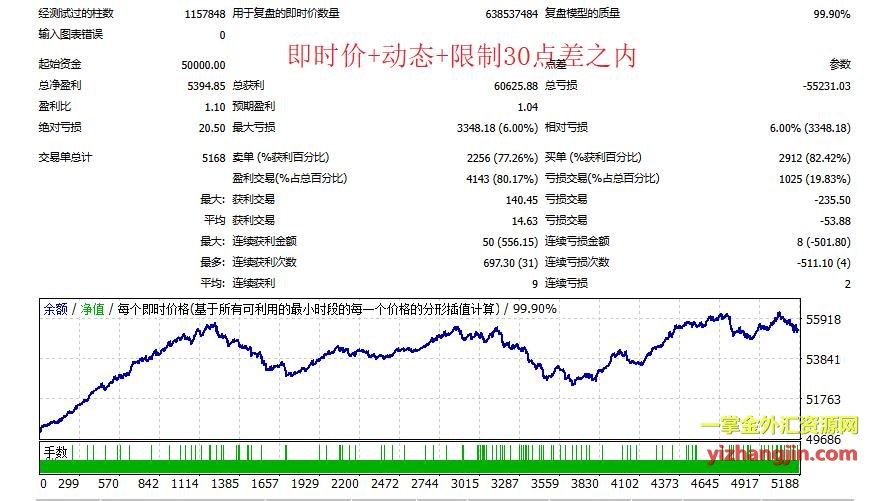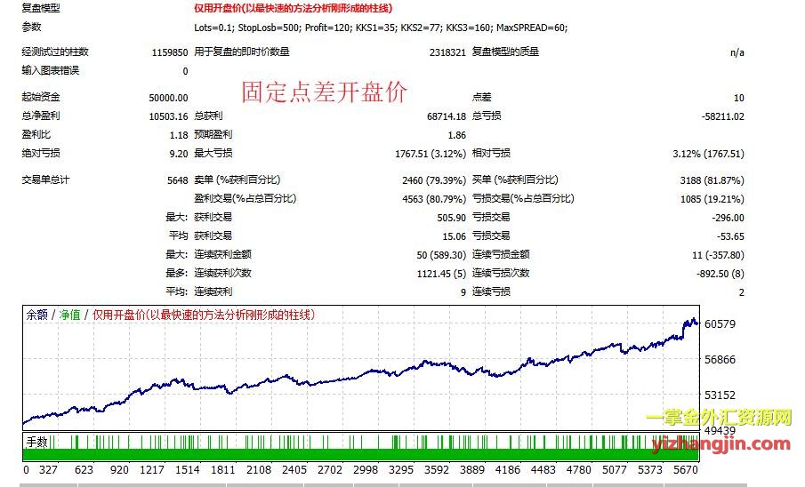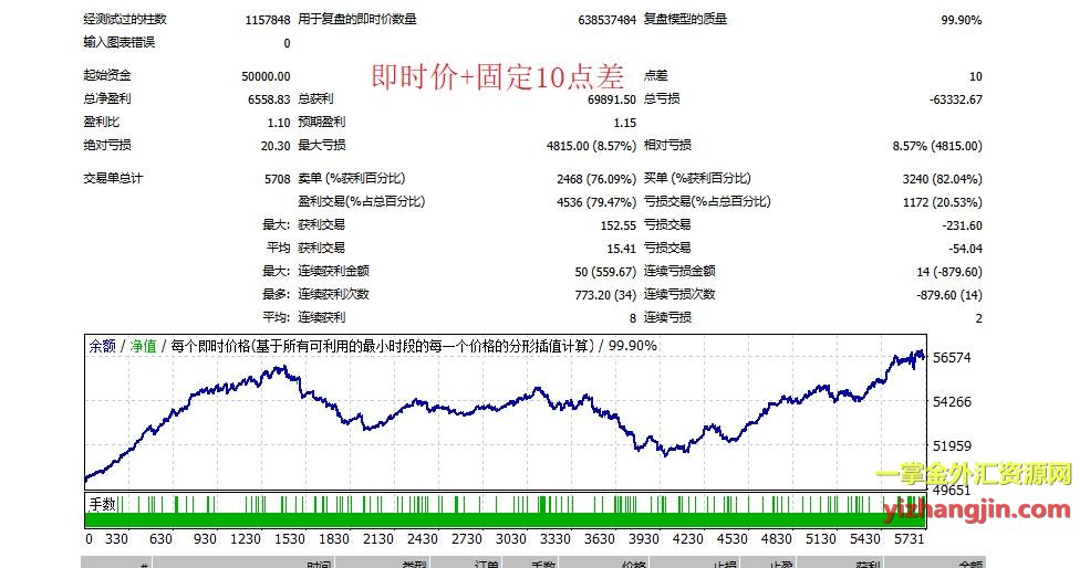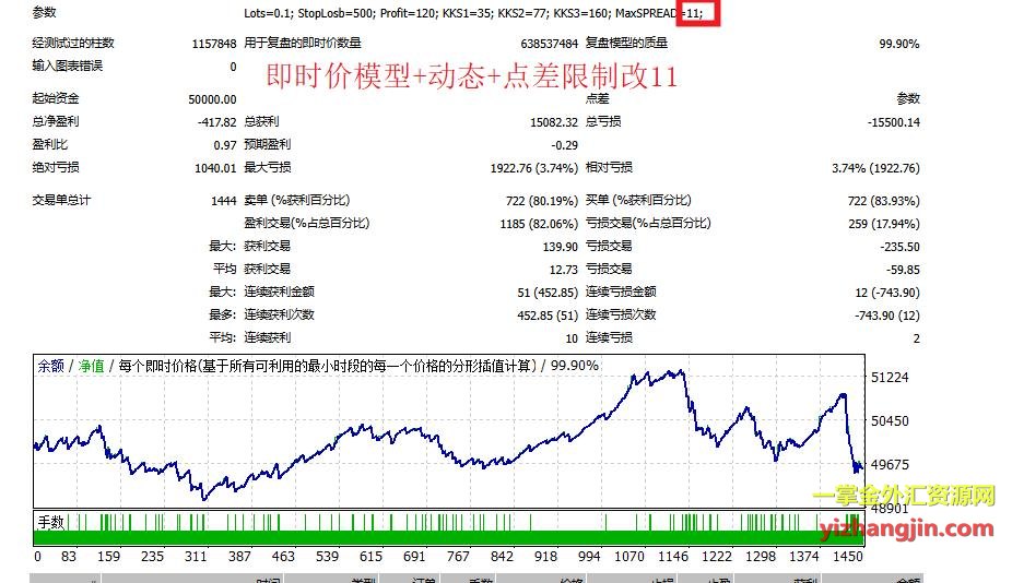 为了帮大家找出原因,我做了几组对照回测。客户提供的“开盘价模型+固定10点差”报告显示资金曲线稳定增长,而“即时价模型+动态点差(贴近IC)”的结果却是大幅震荡的曲线。接着我改用“即时价模型+固定10点差”(第三张图),发现资金曲线依然接近动态点差下的震荡形态——这说明这个ea复盘模型的选择(开盘价 vs 即时价)对结果的影响远大于点差是否动态。进一步地,我在即时价+动态点差的基础上增加了“点差过滤开单11和30”(第4-5张图),单量变化巨大,证明实盘环境中大量时刻的点差确实超过了10点,设置10做回测是不合理的,也证明了大多数ea大家设置30点差过滤的合理性。