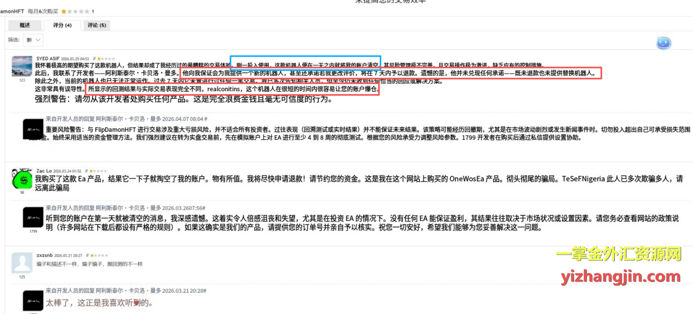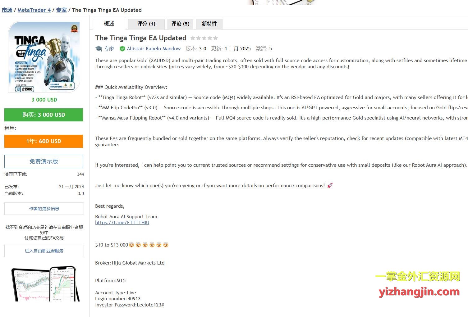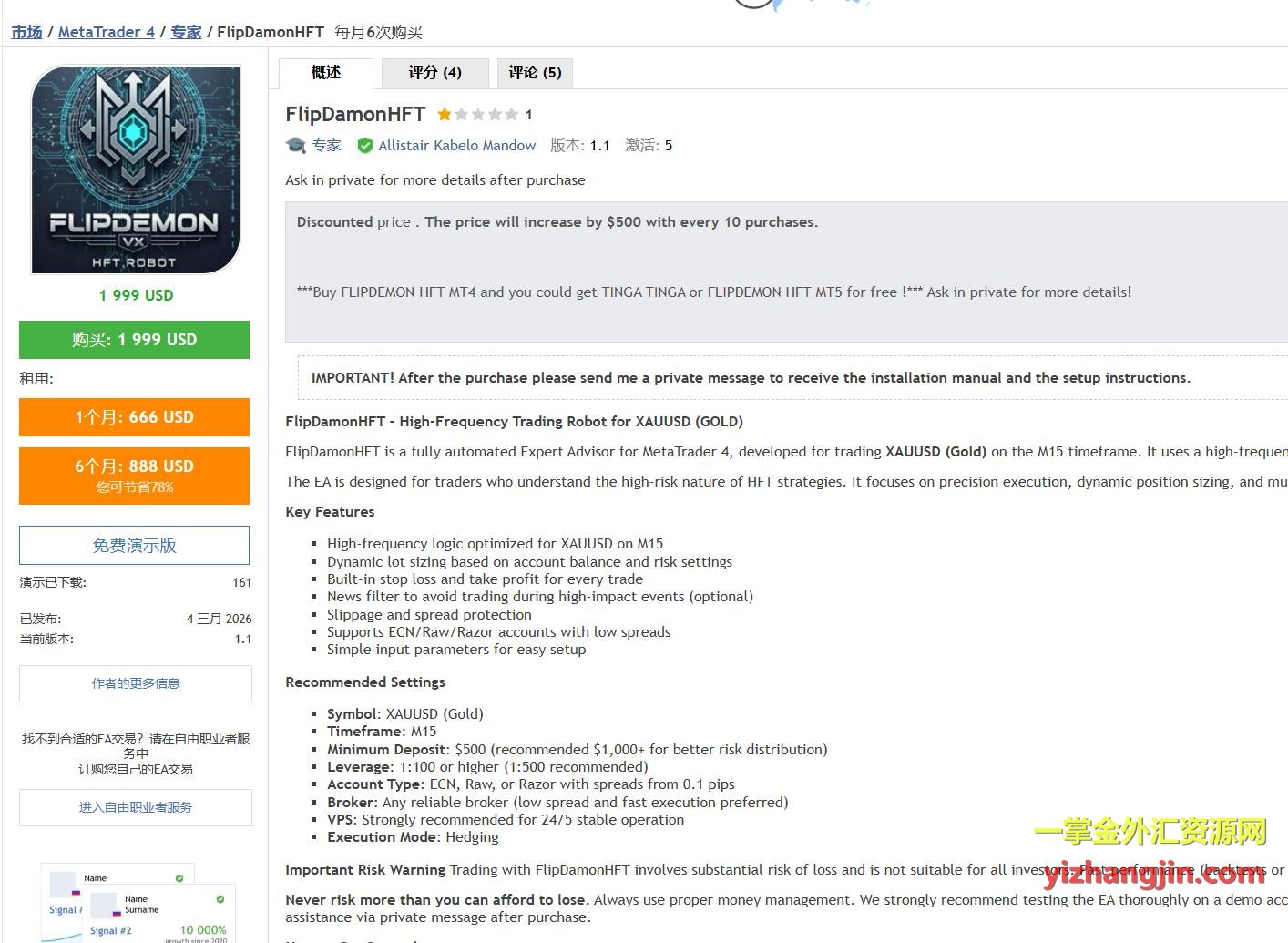 FlipDamonHFT 和 The Tinga Tinga EA Updated 出自同一个作者,分别标价1999美元和3000美元。这种高价EA,绝大多数都是为了割韭菜。