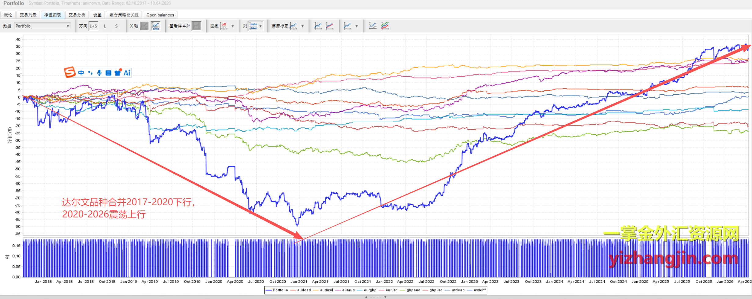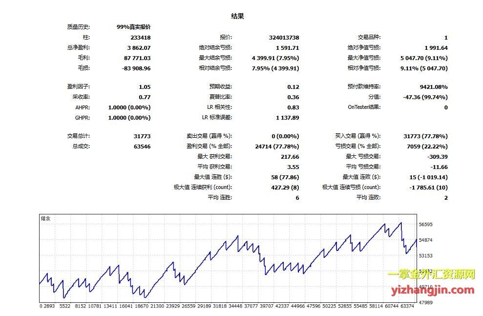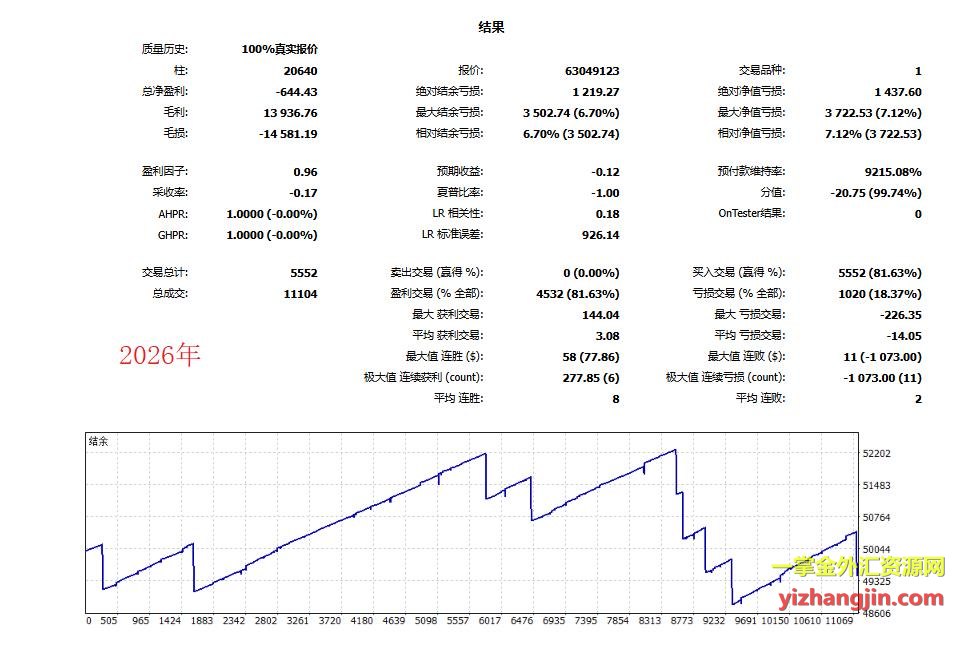 黄金刷单EA是一款整损马丁类策略,没有具体的名字。它属于暴力马丁类型,交易量极大。我测试了近三年及 2026 年的报告(如图),从长期看资金曲线能够坎坷地震荡上行。但导入 QA 分析后发现,该策略只做多单。这不禁让人怀疑存在“根据历史行情倒推开发 EA”的拟合情况。毕竟最近出现了不少这类 EA,他们明知黄金这些年整体上涨,就设置为只做多,刻意迎合历史数据,做出好看的回测资金曲线。总之,刷单不是我想要的,只做多也不是我想要的,因此不再继续研究了。