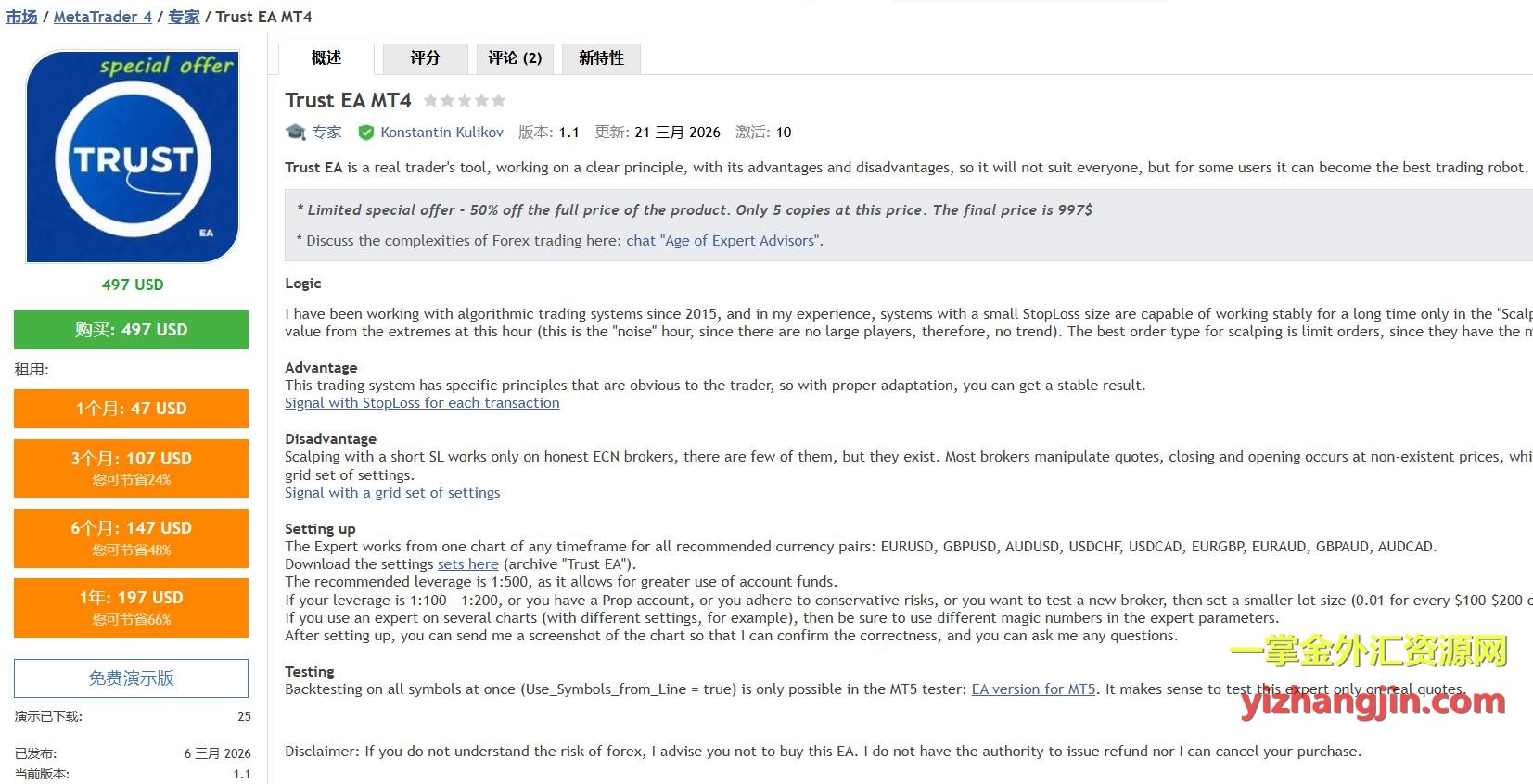 Trust EA MT4 是MQL5上一款典型的凌晨头皮策略。2023 年之后,这类策略基本退出了历史舞台。回想以前,十个热门EA里有八个都是凌晨头皮,那样的时代已经一去不复返了。原因有很多,其中最主要的是各大交易平台对凌晨交易环境的持续“优化”和限制。这类策略的平均盈利空间过小,极易受到外部环境的影响也是重要因素。此外,测不准问题、参考报告价值有限等也是部分原因。总的来说,2016之前稳定赚钱过,2016-2023相对稳定过,至于现在凌晨头皮策略已经过时了——平台越完善,普通交易者越难从中获利。对继续还在追寻稳赚的交易者说一句,稳定赚钱确实存在过,不过只存在于历史中,普通交易者根本不用多想,等曝光到大众眼里的时候,它早就失效了。