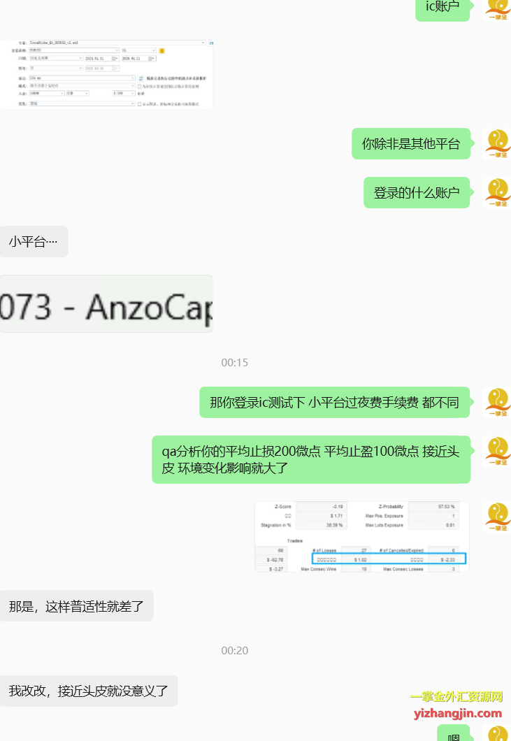 另一款是某客户自行开发的mt5趋势跟踪策略,名字为 TrendRider_EA_EURUSD_v2。客户在小平台上的回测结果,与我这边在IC平台上回测的结果差异较大。此外,该策略的平均止盈空间过小。客户表示会继续修改后再进行评估。回测本身不具备百分之百的参考价值,因此应尽量贴近自己所使用平台的实际情况进行条件设置,才能提高参考有效性。